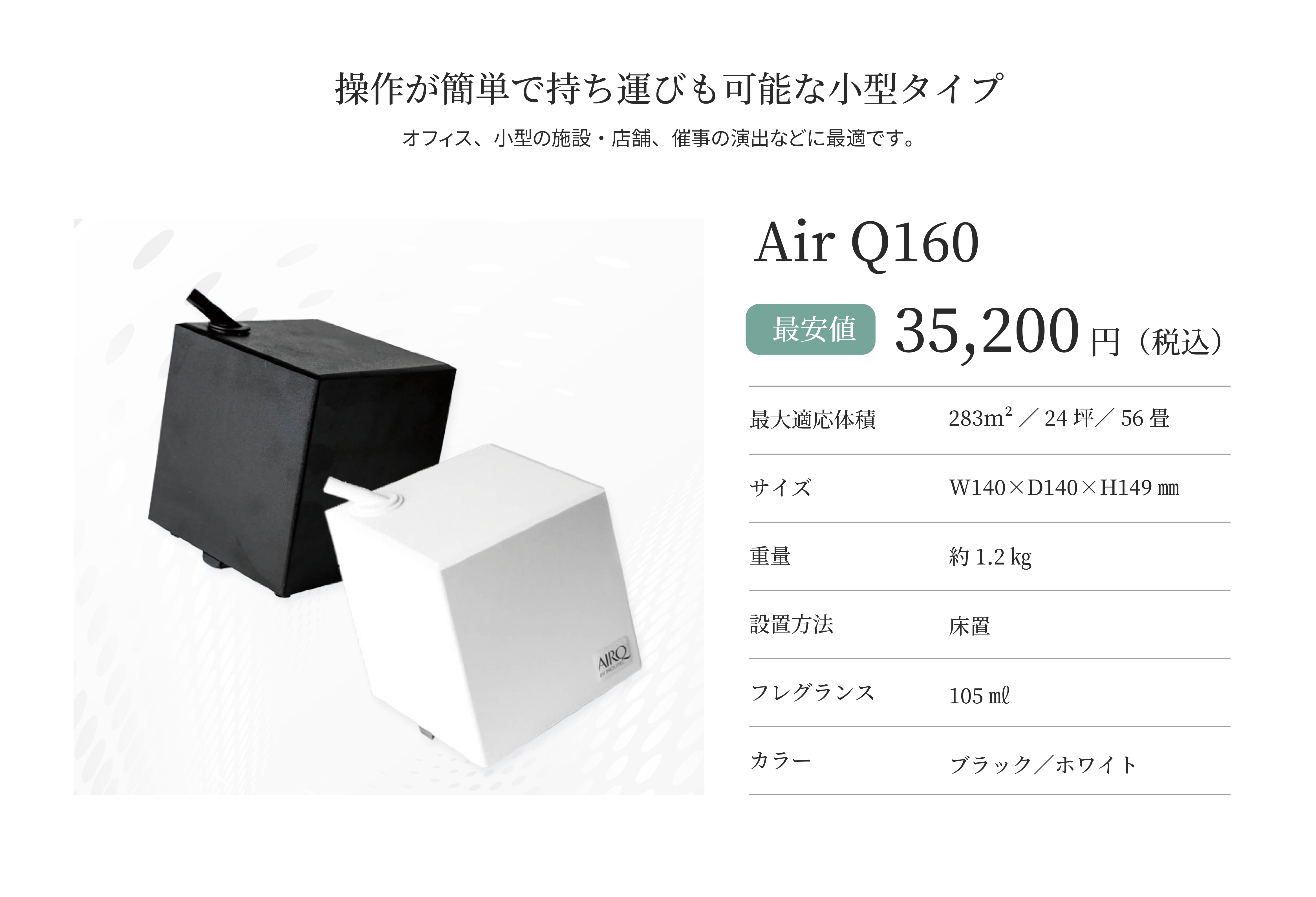 - AAirQ160は特許テクノロジーにより、フレグランスを超微粒子にすることができるため 一般的な芳香剤の香りと比べ、拡散力が格段に高く、空間全体を広く均等に香らせるこ とができます。